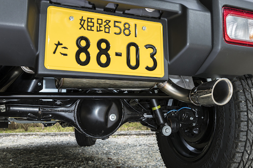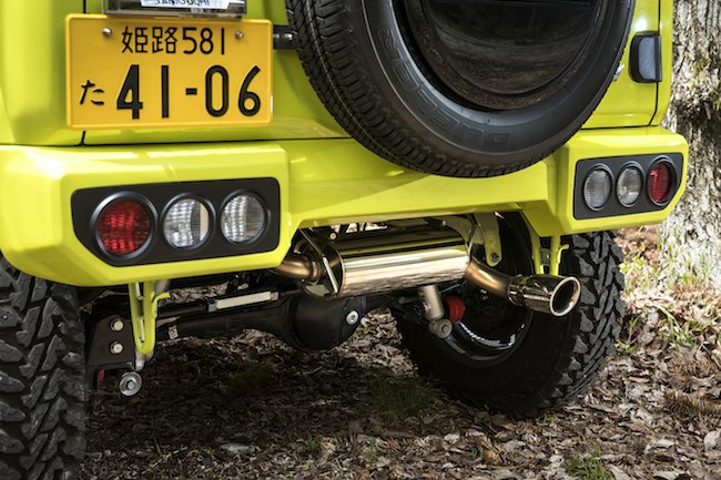 写真は説明のため、同社が開発中(間もなく製品化!)のリアバンパーを装着したジムニーにて撮影を行なったが、ノーマルバンパーでもタイコの下部が見える様になっている。奥ゆかしく、上品だ。