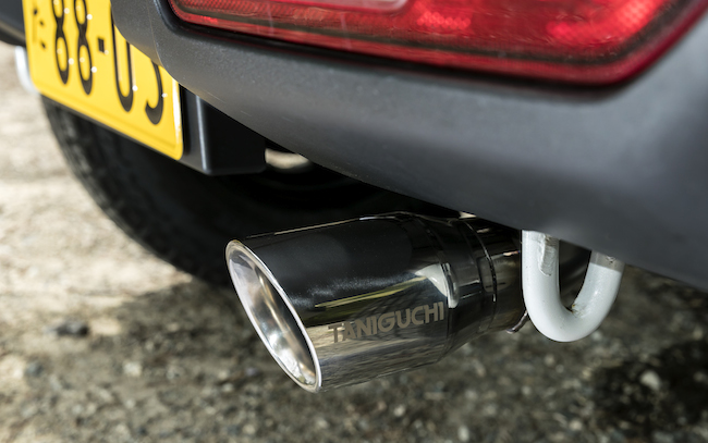 「TANIGUCHI」のロゴが刻印されたテールエンド径は80φ。新型ジムニーのリアビューに存在感を与えている。