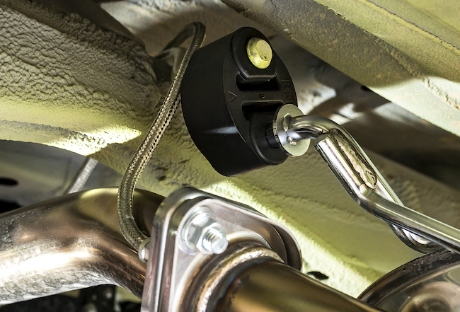 タニグチ定番の(マフラー)アースチューニングは、JB64・74用。マフラーと車体をアース線で繋ぐことで、マフラーに帯電する静電気を取り除き、排気抵抗を低減。1〜2PSアップ。ダイナパックでも検証済み。