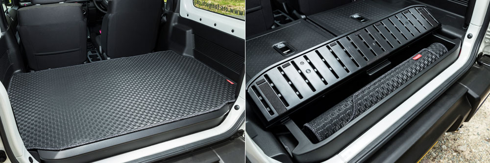 JB64XC・XLグレード/JB74用。ハードに使える丈夫なラバー素材を採用。シート隙間の汚れを防ぐため、分割をなくしたタニグチオリジナル設計。リアシートを倒した状態での荷室使用時に限定したフルカバーの一枚型。未使用時には、丸くたたみ、収納できるところも嬉しい(写真右)。