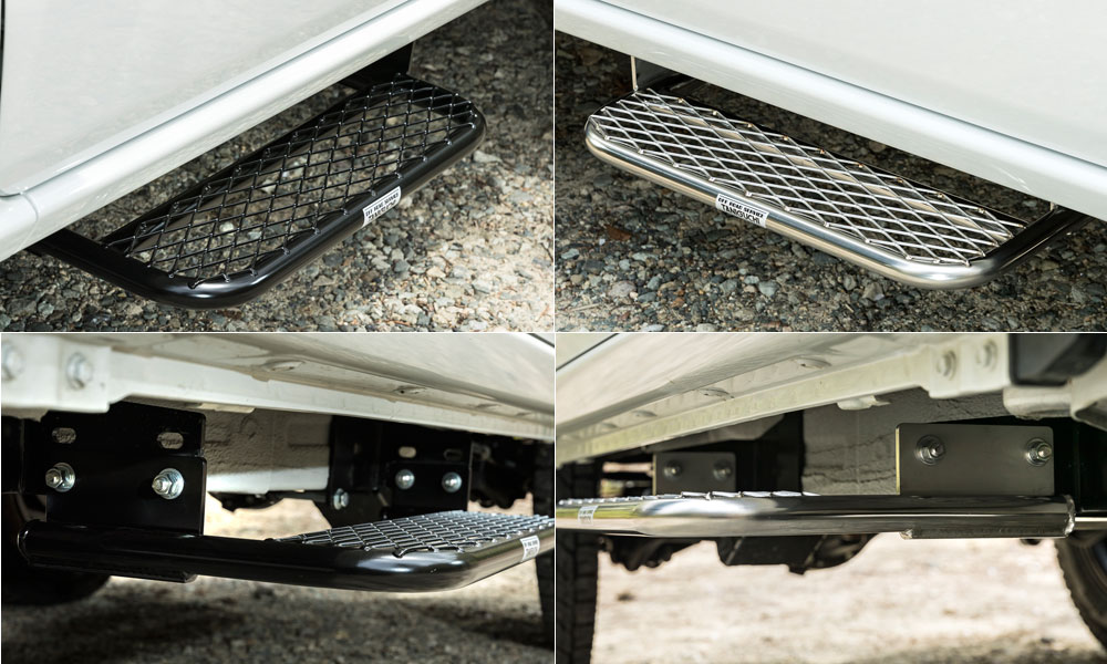 ステップ面の高さ(写真下段)を、サイドシル底面より8cm(写真下段左)と5cm(写真下段右)の2段階に調整が可能。スチール製ブラックとステンレス製の2種類あり。